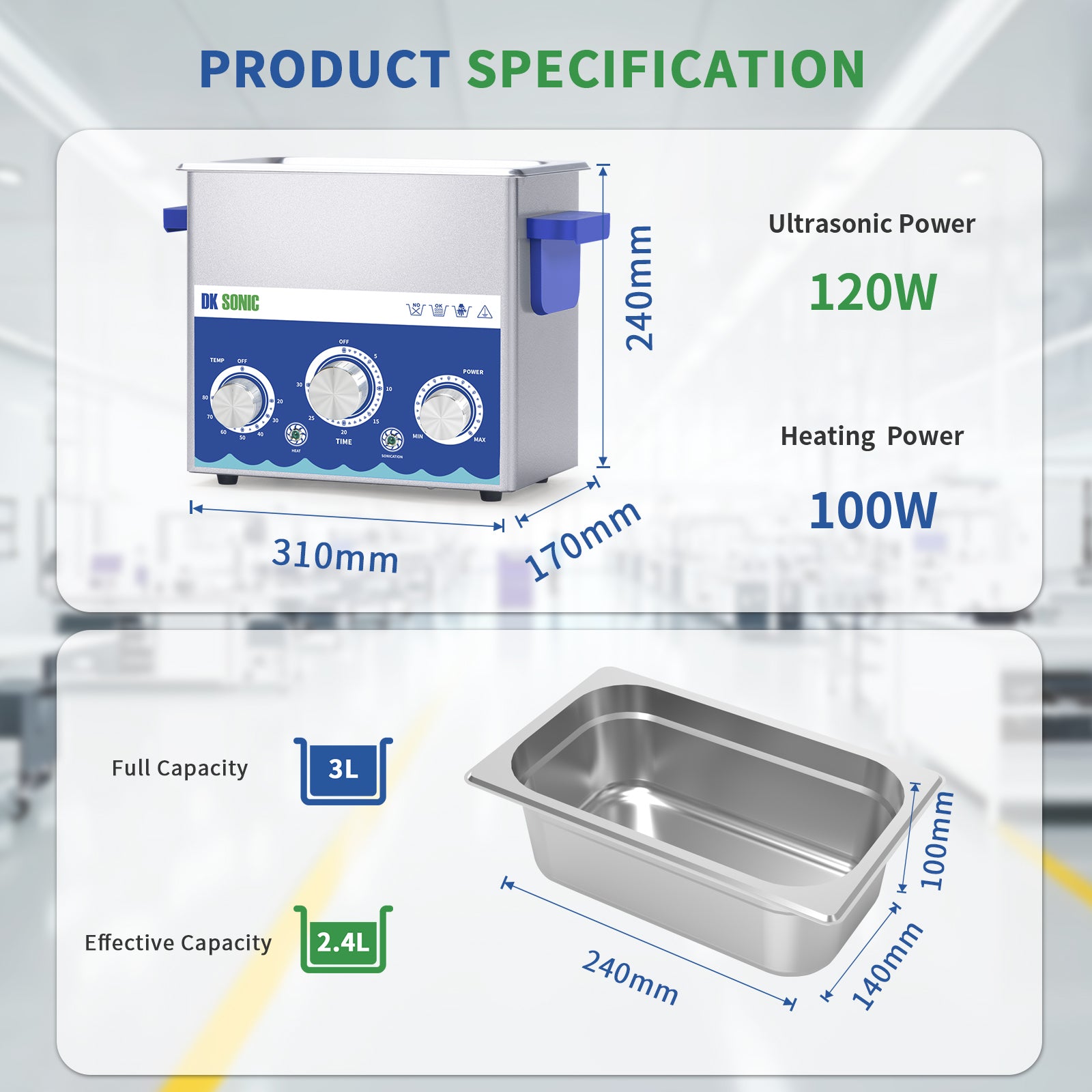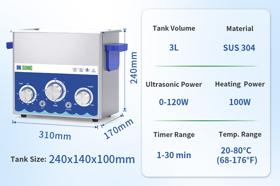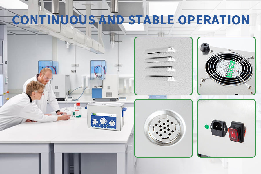 The ultrasonic power can be set as 0~100% circularly by clicking the Power Setting knob. Low power settings are suitable for cleaning delicate components such as circuit boards, whilst high power is ideal for tackling stubborn grease and oil residues.