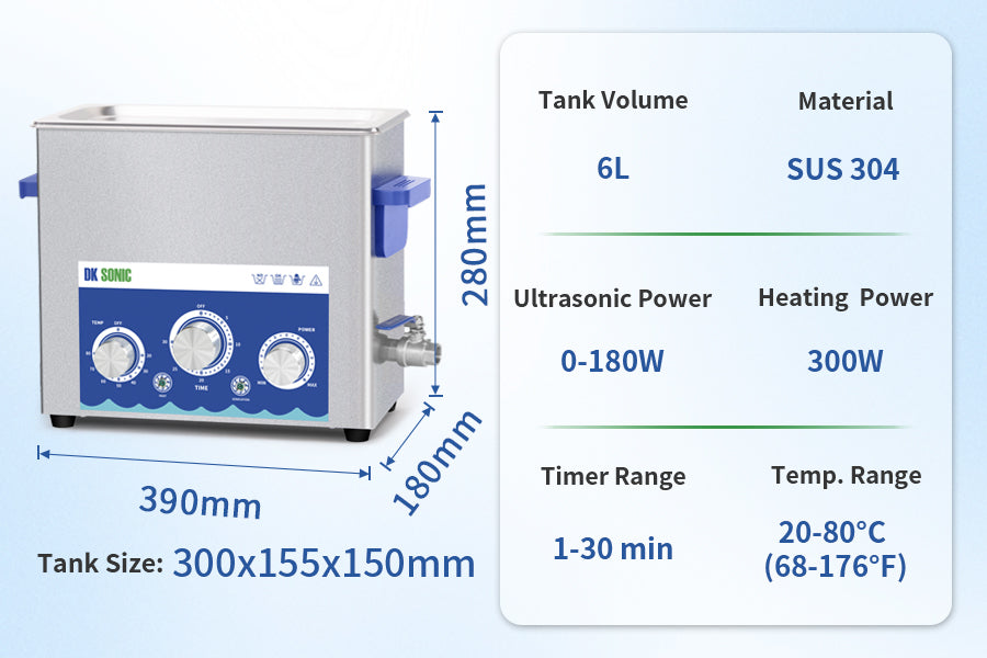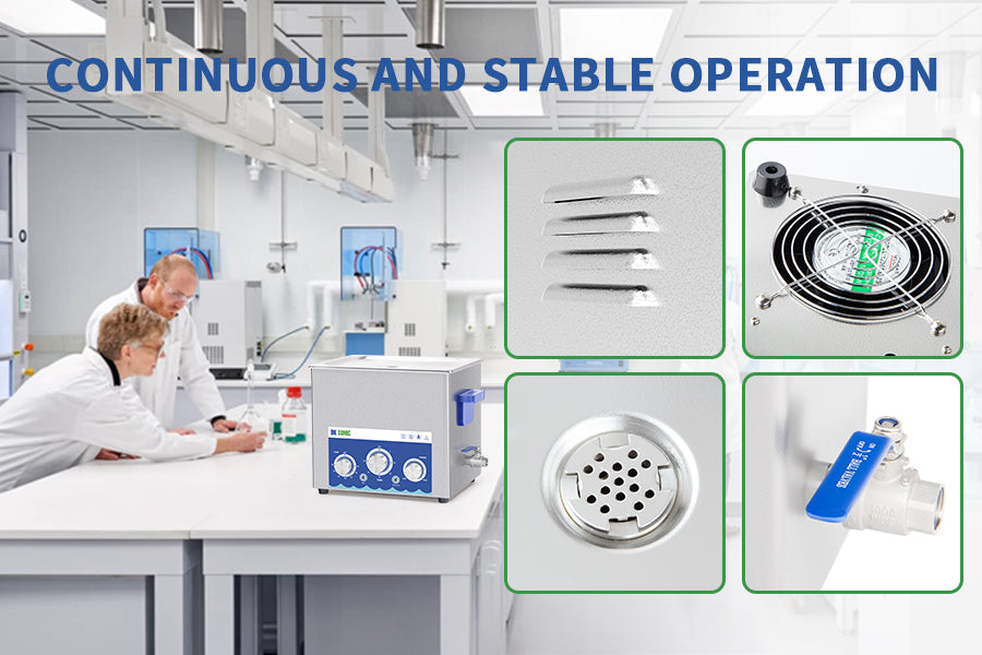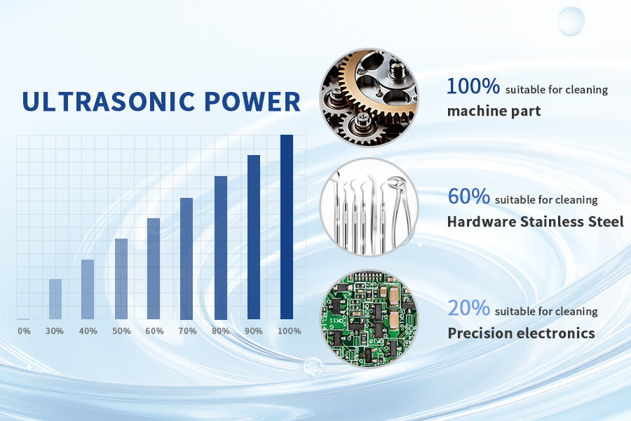 The ultrasonic power can be set as 0~100% circularly by clicking the Power Setting knob. Low power settings are suitable for cleaning delicate components such as circuit boards, whilst high power is ideal for tackling stubborn grease and oil residues.