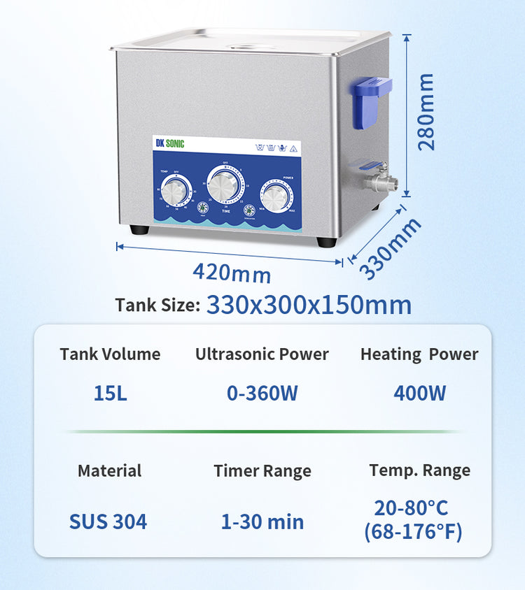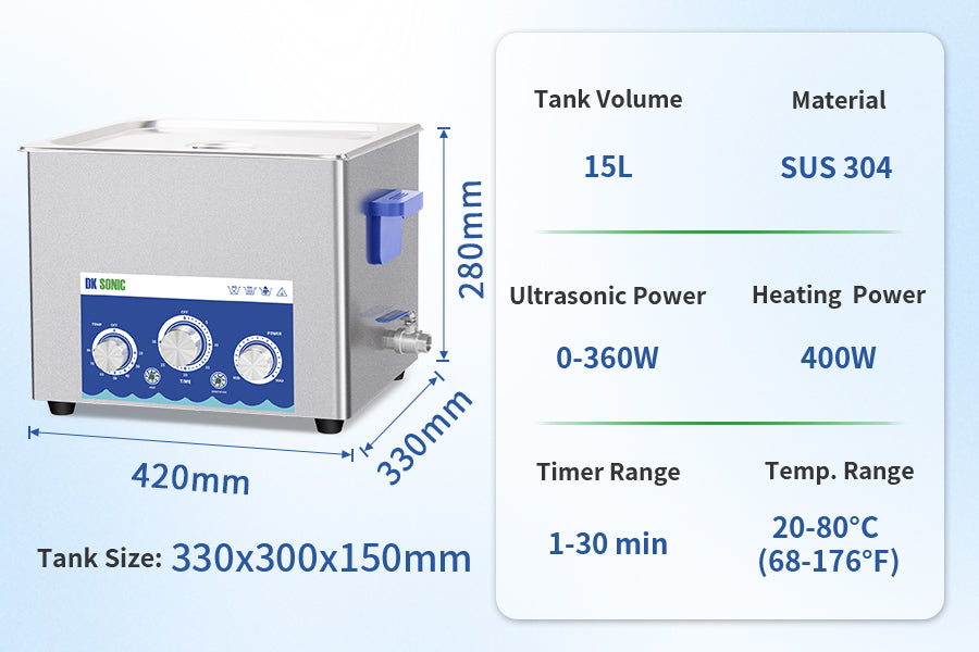 The ultrasonic power can be set as 0~100% circularly by clicking the Power Setting knob. Low power settings are suitable for cleaning delicate components such as circuit boards, whilst high power is ideal for tackling stubborn grease and oil residues.
