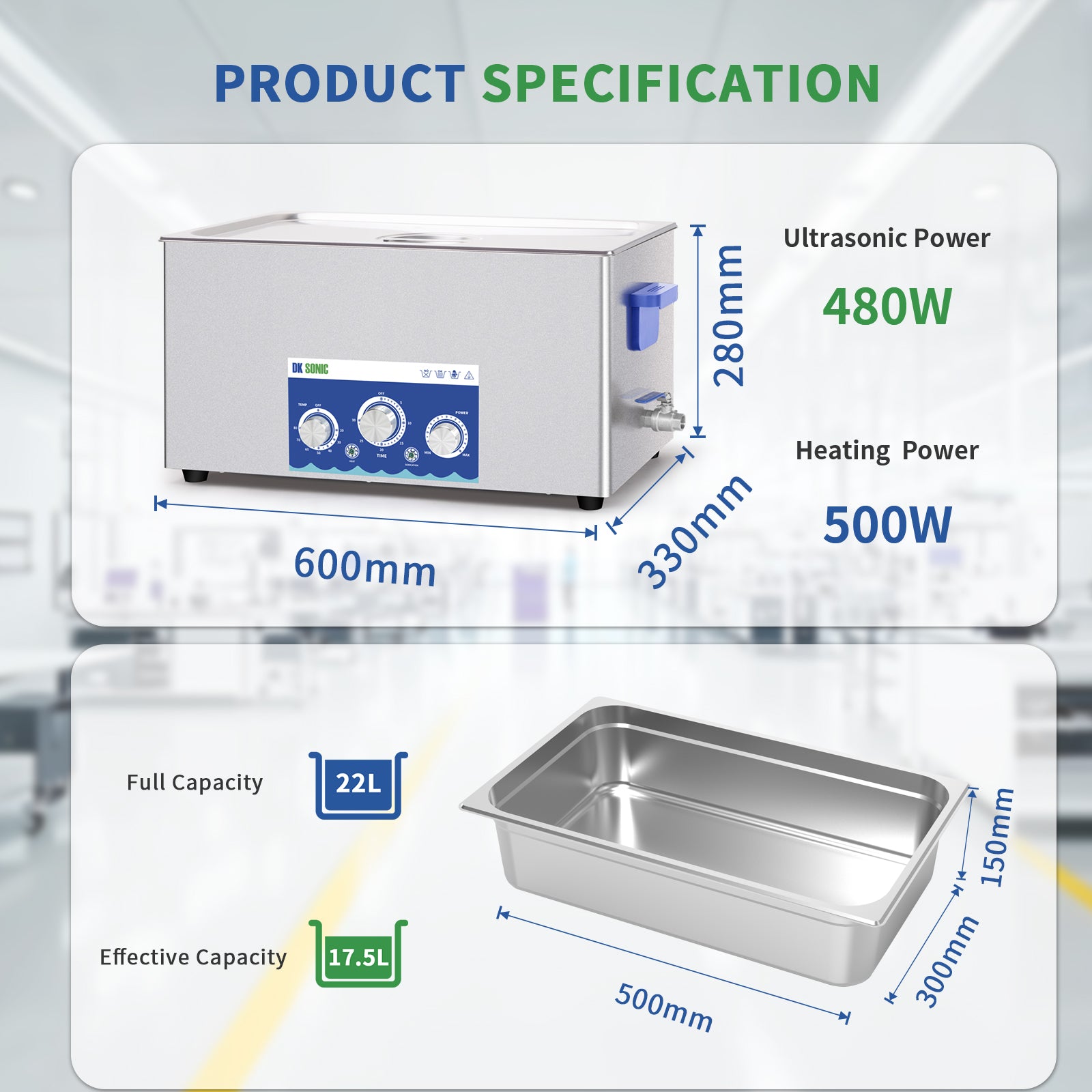 DK SONIC Industrial Ultrasonic Cleaner 22L 480W,Ultrasonic Carburetors Cleaner with Power Adjustable Function, Timer and Heater for Parts,Circuit Board,Chains Cleaning(Include Basket)