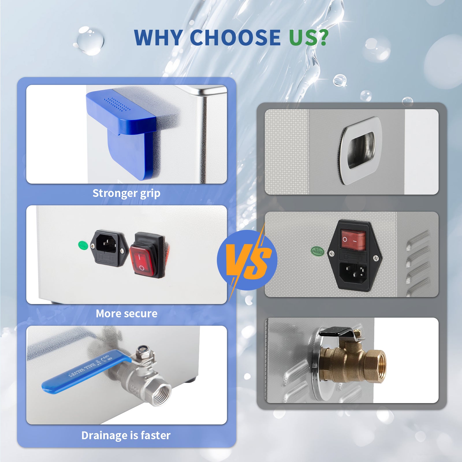 The cleaning tank and drain valve are made with SUS304 stainless steel. SUS304 stainless steel does better in resistance to weak acid or weak alkali solution. However, SUS304 stainless steel materials has no resistance to strong acid or strong alkalis solution, such as hydrochloric acid.