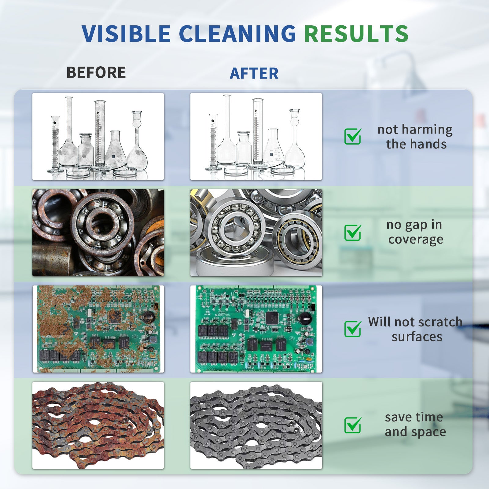 FULLWAVE mode(40KHz) for intensive rinse of blind holes or complicated surfaces; SEMIWAVE mode (semiwave based on 40KHz, i.e. 33KHz) for rough surface cleaning; DEGAS mode for removing ultrasonic fatigue so as to improve cleaning effect; PULSE mode for dynamic rinse of stubborn stains