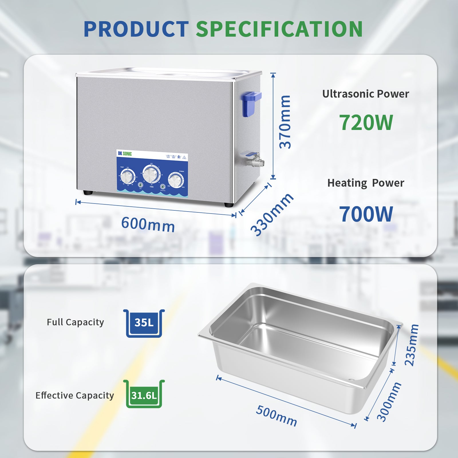 DK SONIC Industrial Ultrasonic Cleaner 37L 720W, Ultrasonic Carburetors Cleaner with Power Adjustable Function, Timer and Heater for Parts,Circuit Board,Chains Cleaning(Include Basket)